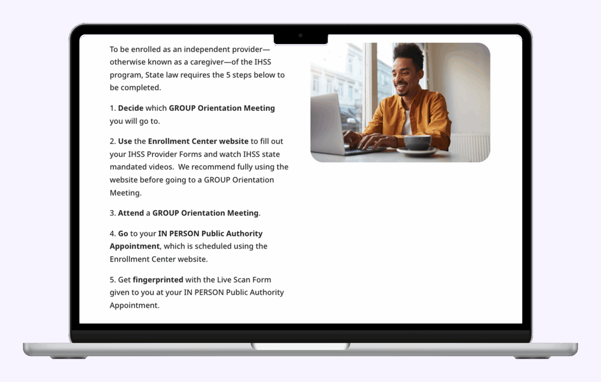 Public Authority Services by Sourcewise successfully enrolls around 700 IHSS caregivers monthly in Santa Clara County, California, with thousands of potential caregivers using the website to find information about the program and understand how to complete all of the steps for enrollment.