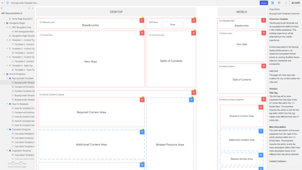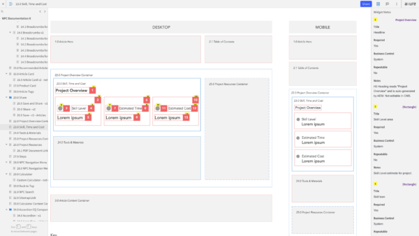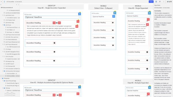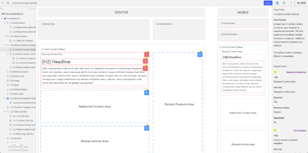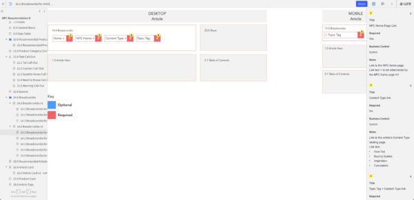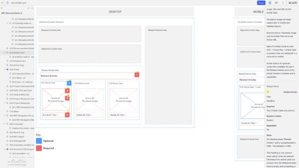 Once we had an inventory of all the page templates and content components that we needed to support the articles that would be migrated to the new CMS, I created annotated wireframes in Axure. These detailed wireframes described how the component would behave on the front-end of the website and how it would function in the CMS for web authors. The annotations included instructions on character counts, whether a field was required or not, or if a field was generated by the system and not editable in the CMS (some SEO tags worked this way). For page templates, the annotations would specify which components were optional vs required, how many components could be added, etc.